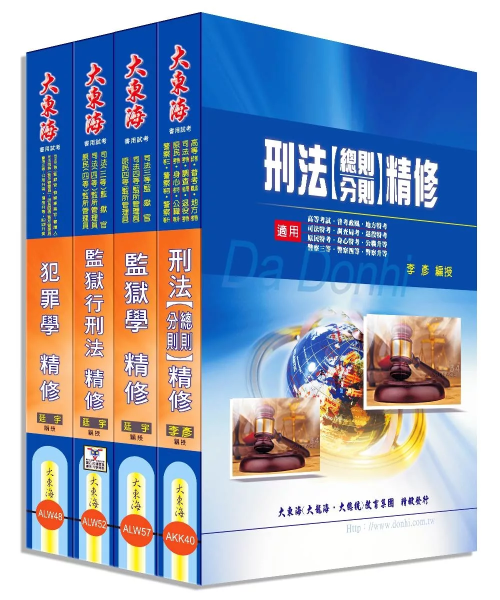由大東海超強司法名師團隊精心撰寫,推出「監所管理員」系列專業科目套書,針對必考命題大綱所編授,將必考的四科專業科目讓考生一次掌握,把繁複的刑法法條重新整理,以及令考生陌生的監獄學、犯罪學和監獄行刑法條列式教學,使考生易於理解,並針對專有特殊名詞加以釋義,每本書並附上歷屆試題,讓考生增加實戰經驗,反覆練習,有助於將所學觀念統整,檢視自己的學習弱點,即刻補救!應考實力迅速大幅攀升,輕鬆就能進入夢想中的職涯生活!