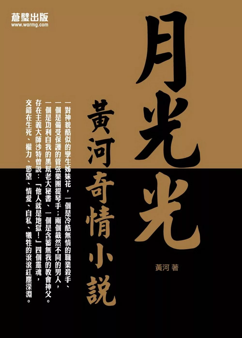 別人認為不可能的事情,偏偏是黃河老師的最愛!不喜歡被定型、求自己的創作極限,正好就是黃河樂此不疲的事!《月光光》是一本未曾付印發行的奇情小說,更神奇的是本書的創作靈感與故事大剛,居然來自黃河在擔任艦長午夜夢迴時的一個夢!夢醒之後,夢中的歌詞呼應著船舷外的黑色大海與皎潔月光,如此便誕生了這部由當時身為「海軍艦長」所創作的奇情異色小說。