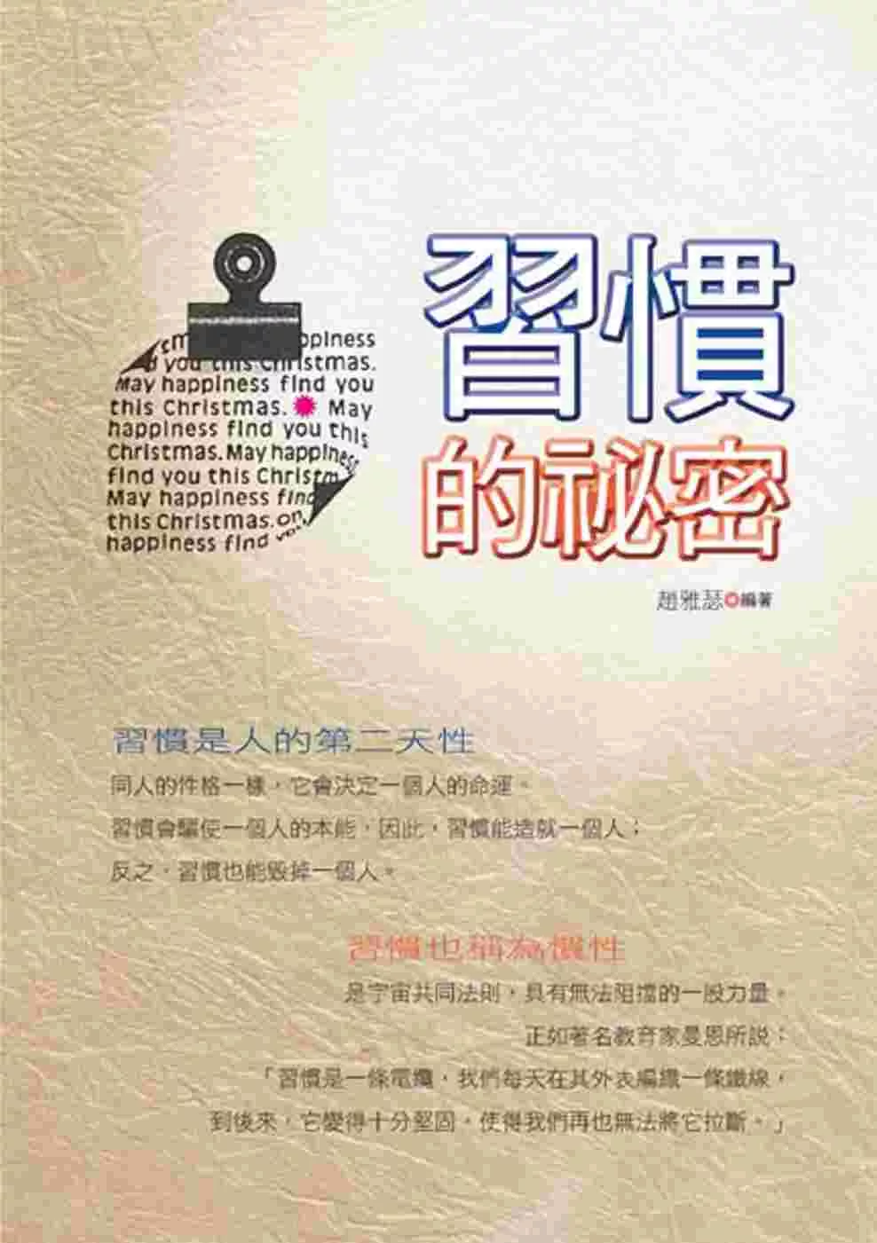 本書從影響你一生的習慣入手,根據工作、休閒、學習、思維、健康等生活的各個不同方面和角度向讀者講述哪些習慣是我們必備的,哪些習慣是我們應堅決制止的,哪些習慣是可以改進的。讓讀者在輕鬆的閱讀中,總結自己的角角落落,體味生活的方方面面,慢慢養成足以讓自己快慰一生的良好習慣。就像著名心理學家、哲學家威廉‧詹姆斯說的︰「播下一個行動,你將收獲一種習慣;播下一種習慣,你將收獲一種性格;播下一種性格,你將收獲一種命運。」