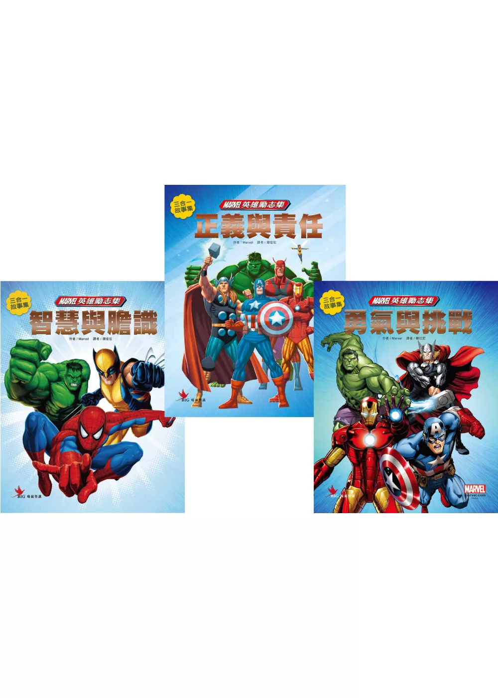 《Marvel英雄勵志集》系列精選大家熟知的Marvel超級英雄故事,搭配品德教育的內容,讓孩子在潛移默化中學習到英雄們的優良品德。本套書收錄三本《Marvel英雄勵志集》──勇氣與挑戰、智慧與膽識、正義與責任,每本各收錄三篇精彩的Marvel英雄故事,讓孩子藉由Marvel超級英雄們展現的高尚品德,來了解如何處理人生課題,是最好的品德教育示範素材。