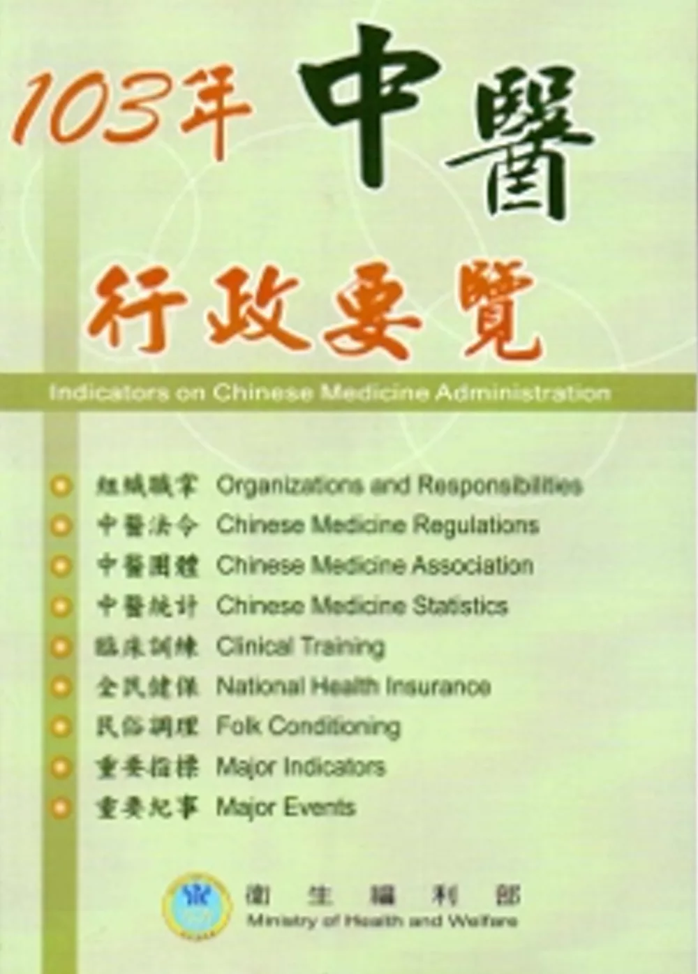 103年中醫行政相關資料匯整。隨著我國經濟蓬勃發展及國民生活水準提高,民眾對醫療衛生保健需求更加殷切,衛生工作面臨嶄新且多元的挑戰;因此,各衛生機關、相關團體及機構亟需掌握正確衛生現況資料,以因應時代脈動之需求。近年來,國內醫療保健有回歸自然趨勢,國人對中醫藥的需求與日俱增,本部爰蒐集最新中醫醫政相關資料,彙編成「中醫行政要覽」,提供衛生機關同仁、中醫醫事相關人員、團體及機構參考。